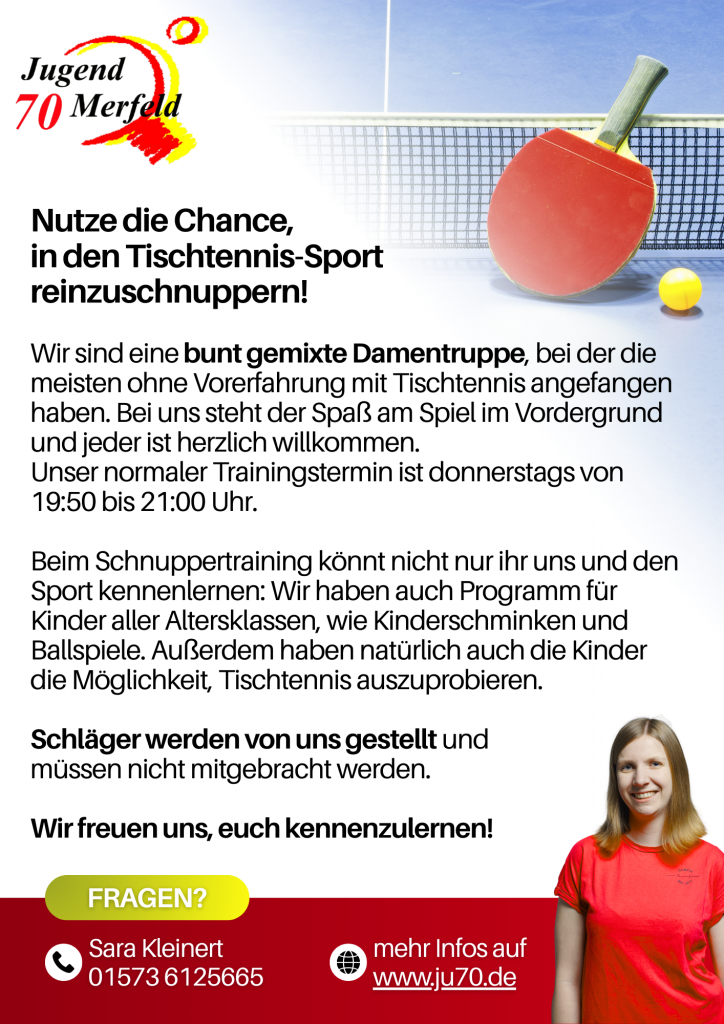 Komme vorbei und lerne unsere Hobby-Damentruppe kennen. Bei uns ist keinerlei Vorerfahrung nötig. Es geht um den Spaß am Sport. Tischtennisschläger werden vor Ort gestellt und brauchen nicht mitgebracht werden.